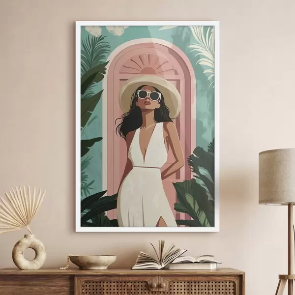 Poster Femeie în ochelari de soare și pălărie, natură tropicală, arhitectură Nr f44152