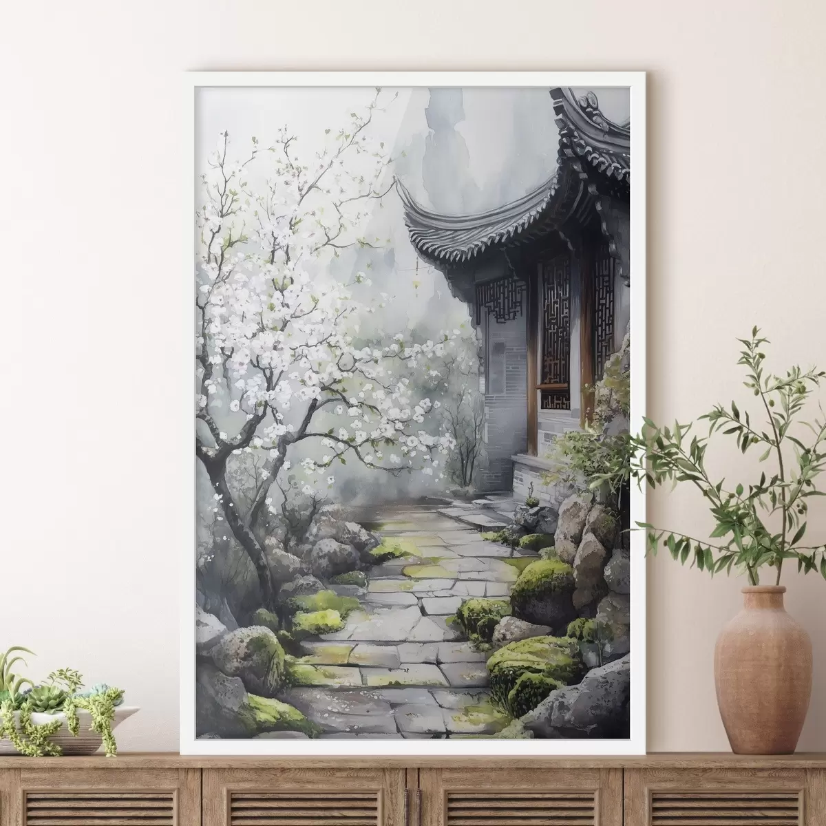 Poster Japonia grădină cu cireș și casă, oriental, stil acuarelă Nr f44309