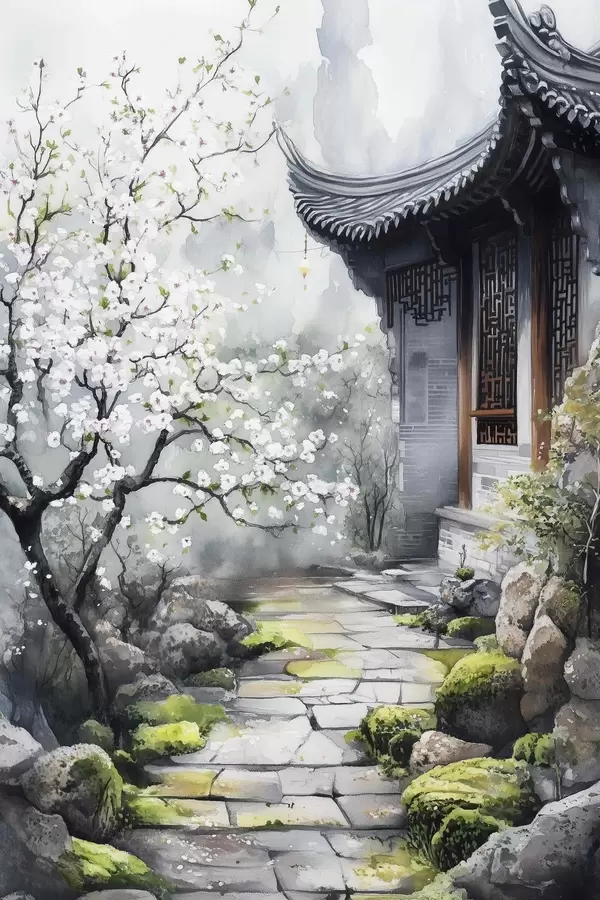 Poster Japonia grădină cu cireș și casă, oriental, stil acuarelă Nr f44309