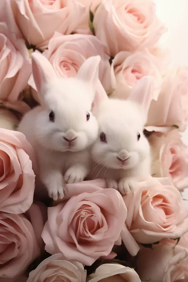 Poster Doi iepuri albi în flori delicate de trandafir f44380