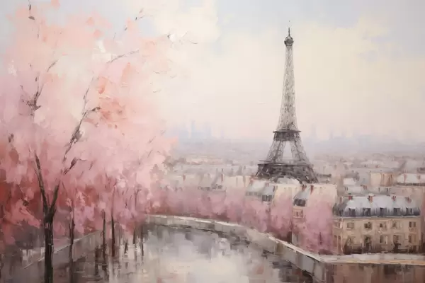 Poster Turnul Eiffel din Paris cu cireși înfloriți primăvara, culori pastelate moi Nr f44398