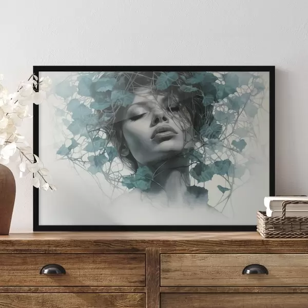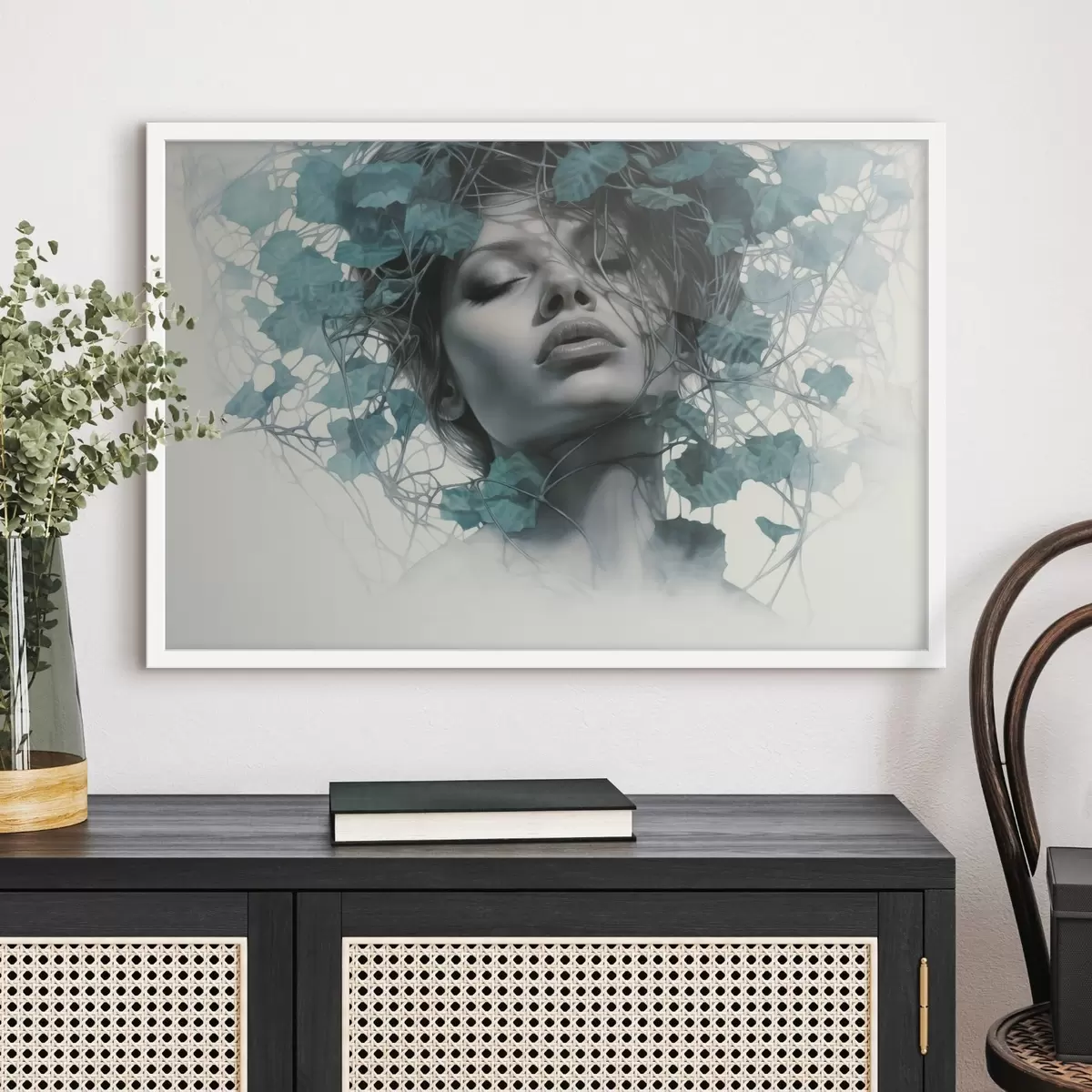 Poster Portret de femeie cu ochii închiși, înconjurată de frunze verzi și ramuri f44399