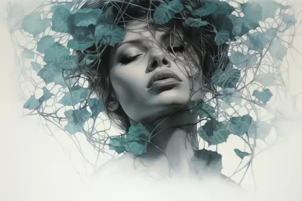 Poster Portret de femeie cu ochii închiși, înconjurată de frunze verzi și ramuri Nr f44399
