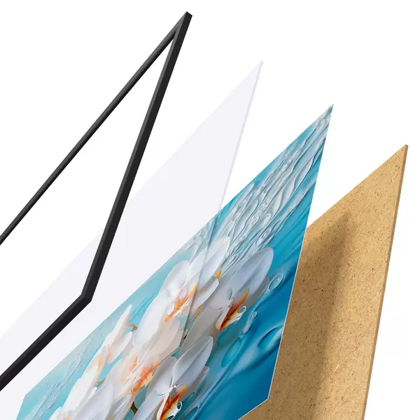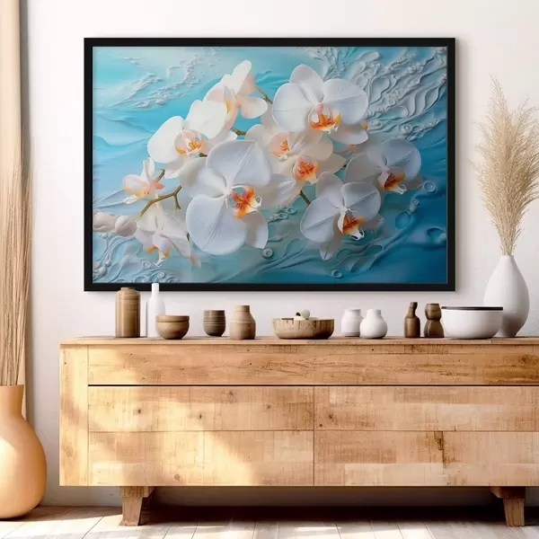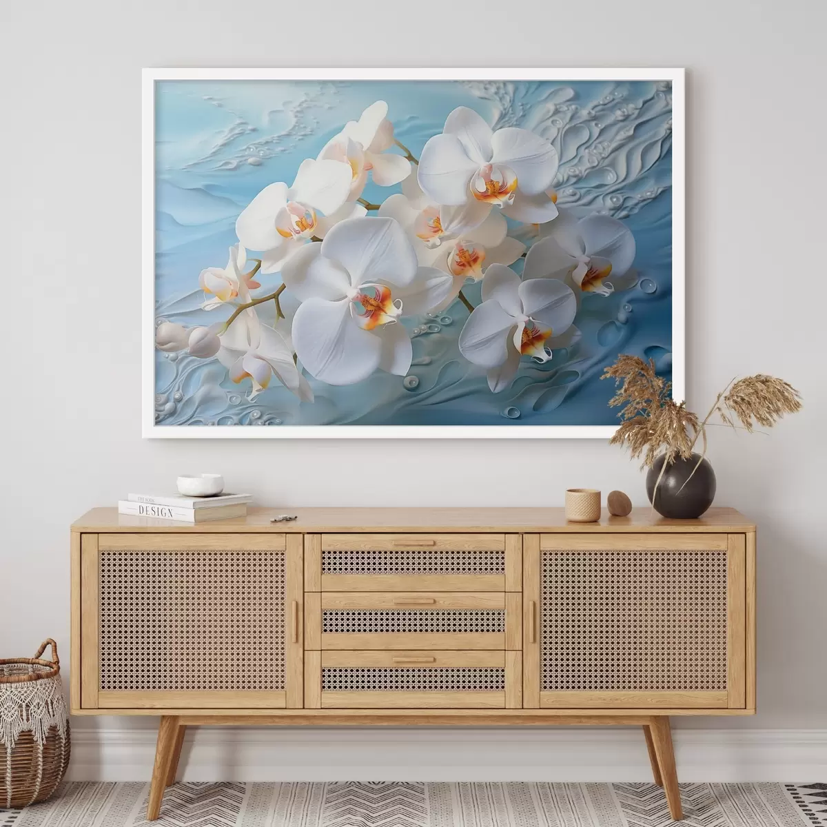 Poster Orhidee albe, aranjate pe o suprafață albastru deschis cu picături de apă, iluminare moale Nr f44401