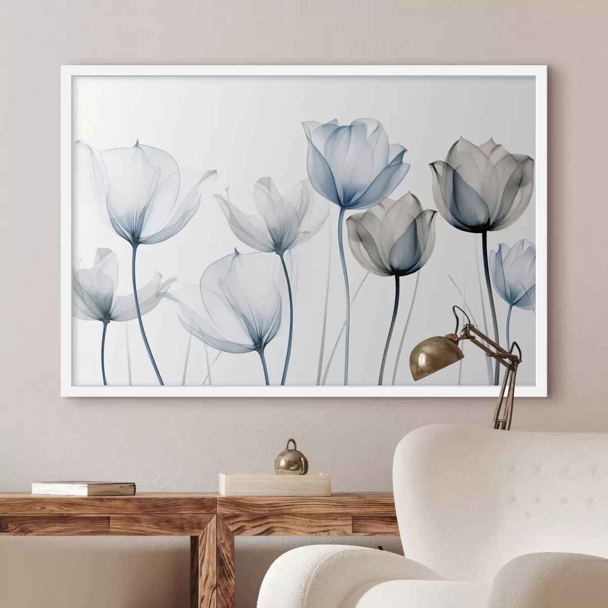 Poster Lalele translucide albastre și albe cu tulpini lungi, pe un fundal alb simplu f44409