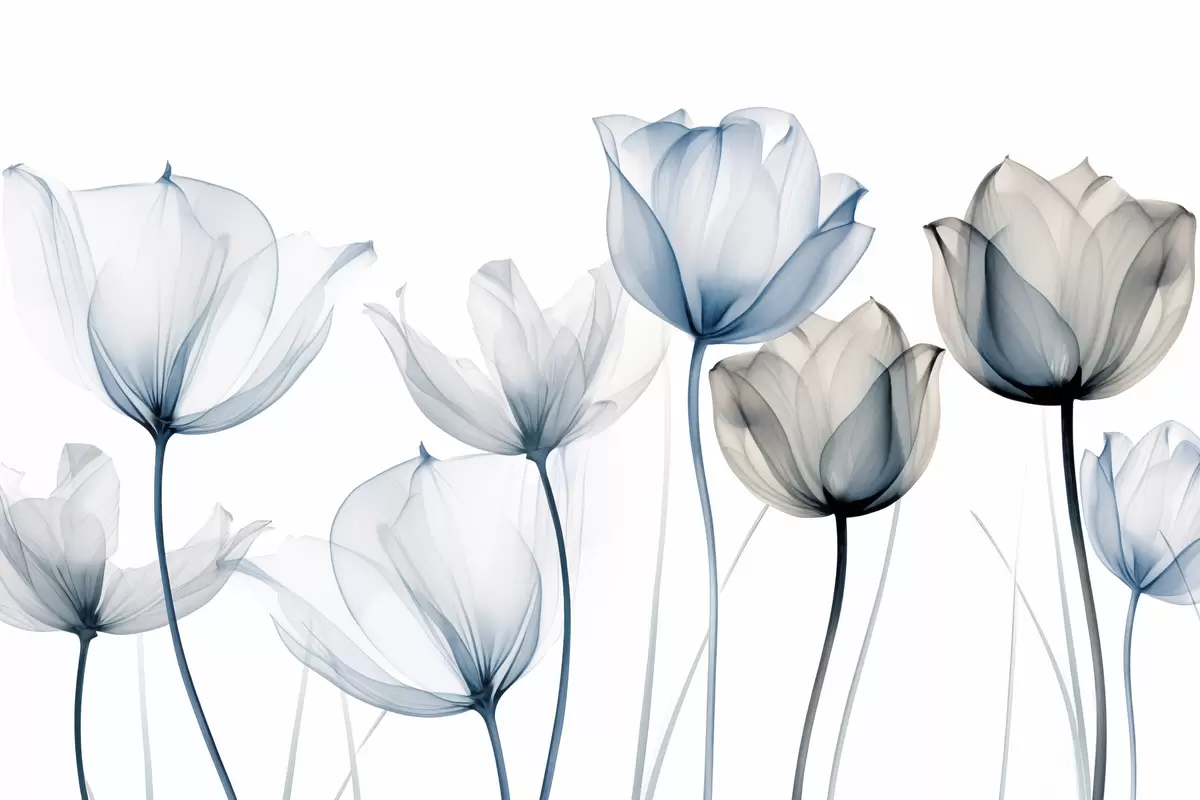 Poster Lalele translucide albastre și albe cu tulpini lungi, pe un fundal alb simplu f44409