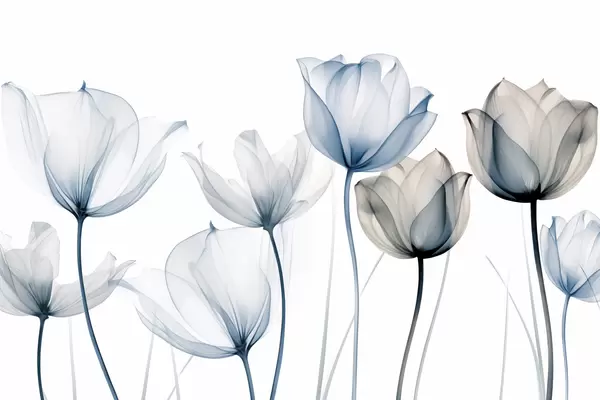 Poster Lalele translucide albastre și albe cu tulpini lungi, pe un fundal alb simplu Nr f44409