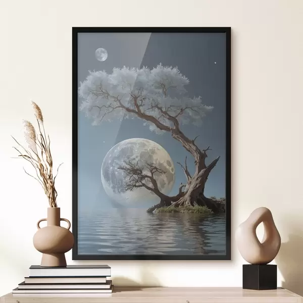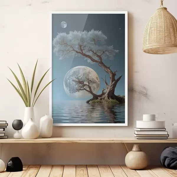 Poster Copac în creștere în mijlocul unui lac pe fundal luna Nr f44481