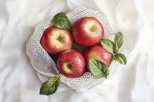 Poster Mere roșii în sac de in cu frunze de mentă, stil rustic, fructe Nr f44609