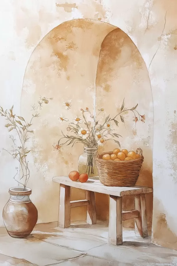Poster Arc de perete cu borcan antic, flori de mușețel și coș de portocale f44613