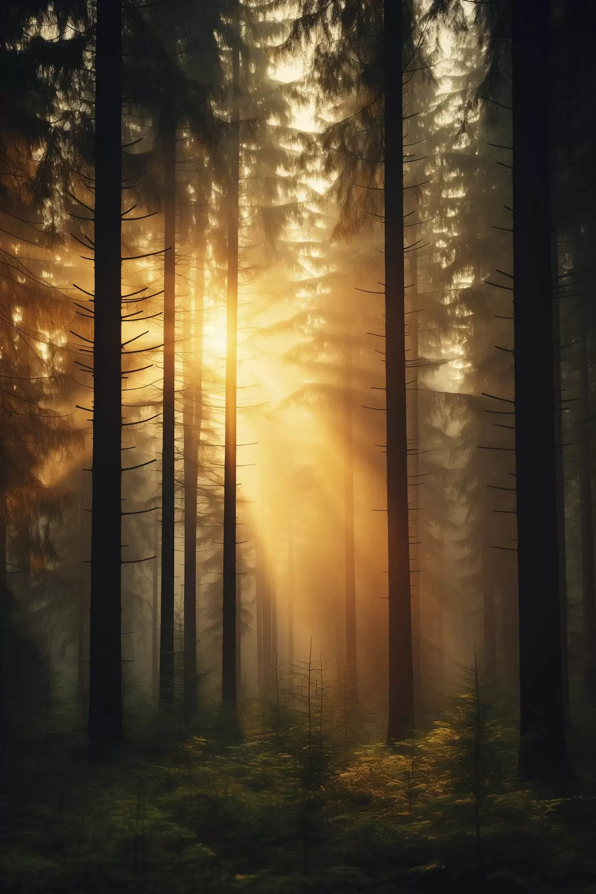 Poster Pădure de pin densă cu lumina apusului de soare, realism, natură Nr f44615