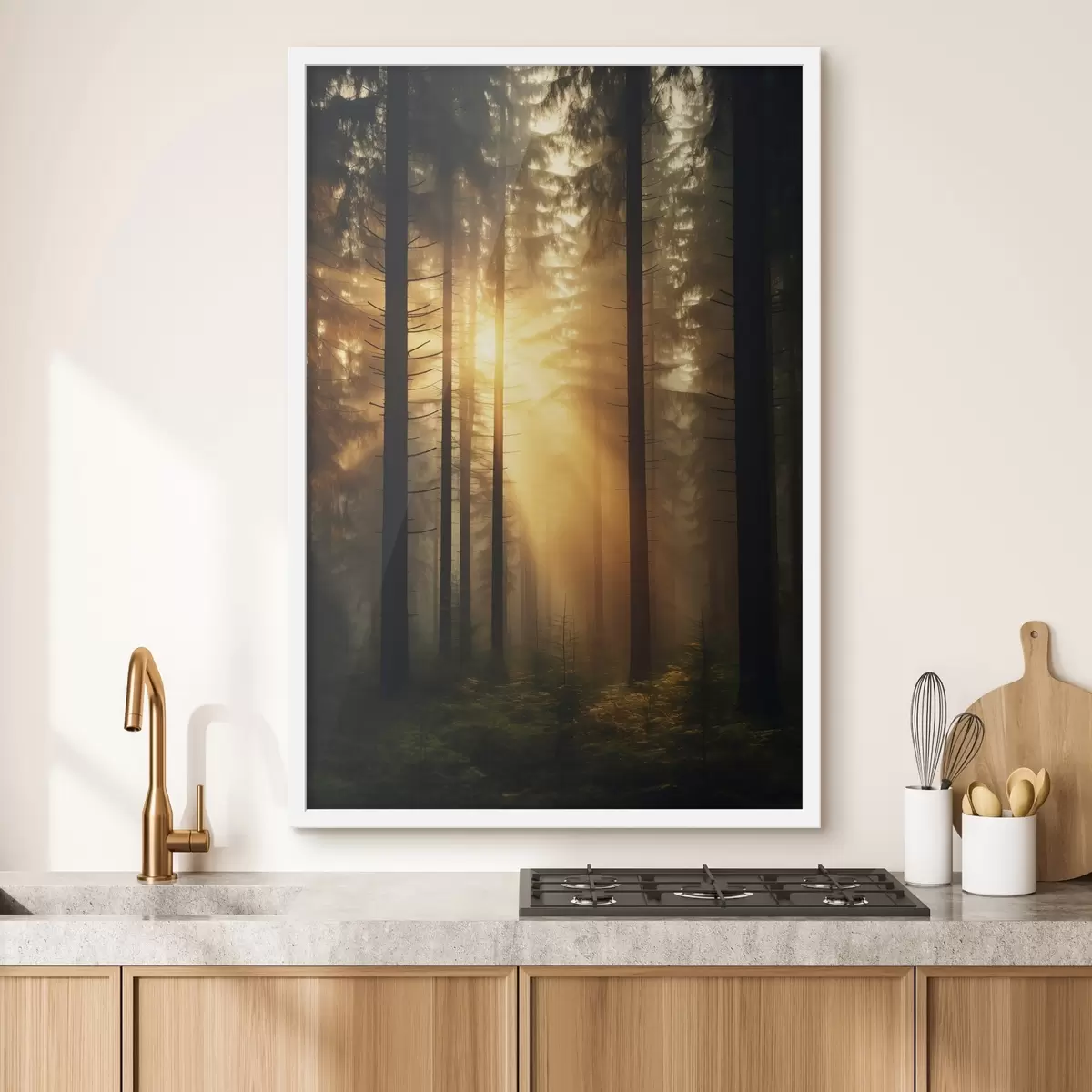 Poster Pădure de pin densă cu lumina apusului de soare, realism, natură f44615