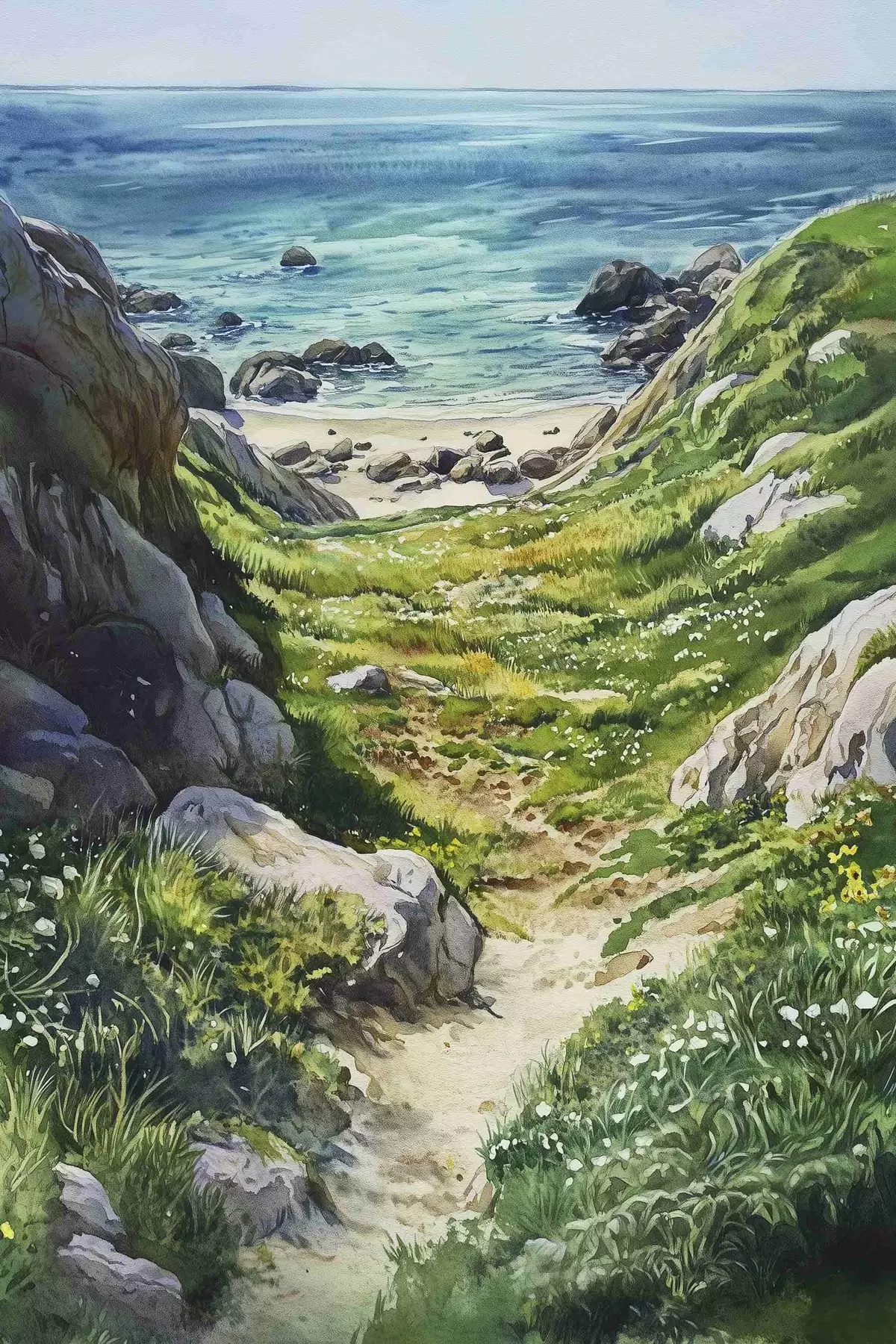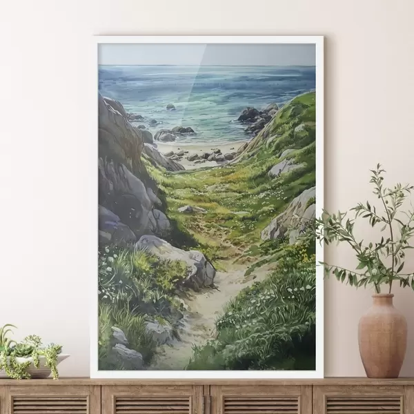 Poster Coasta mării cu stânci și iarbă verde, stil acuarelă, vară Nr f44616
