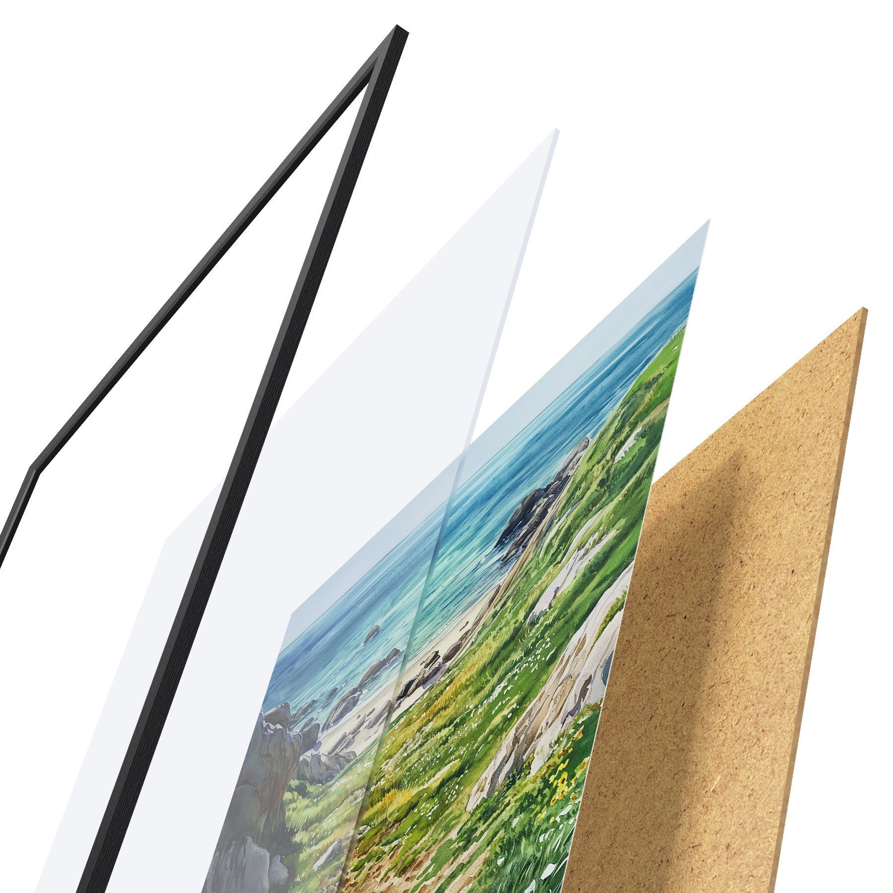 Poster Coasta mării cu stânci și iarbă verde, stil acuarelă, vară f44616
