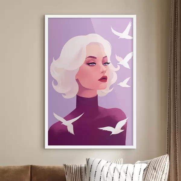 Poster Portret de femeie cu păr alb pe fundal cu păsări Nr f44681