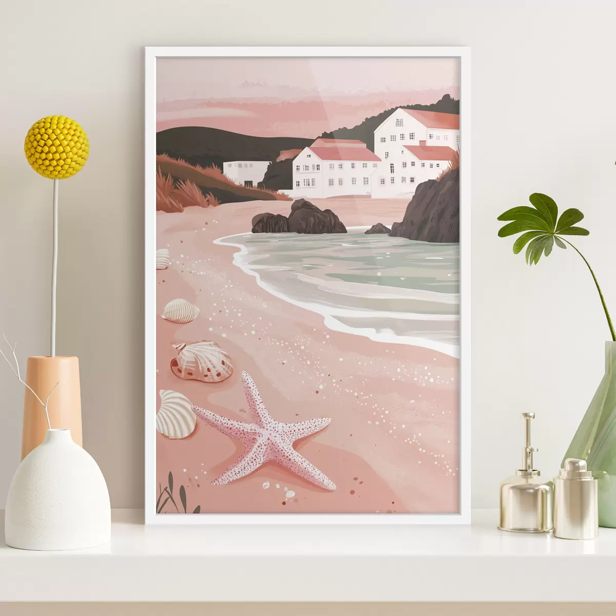 Poster Plajă roz confortabilă cu case albe și scoici Nr f44713