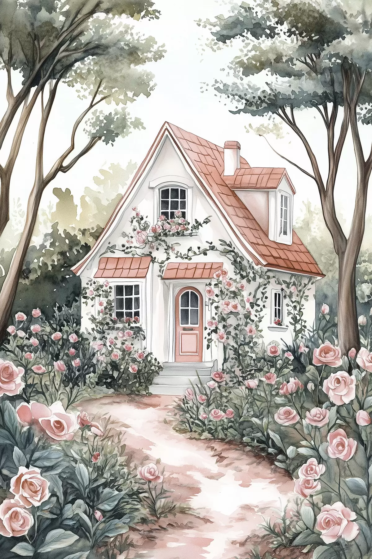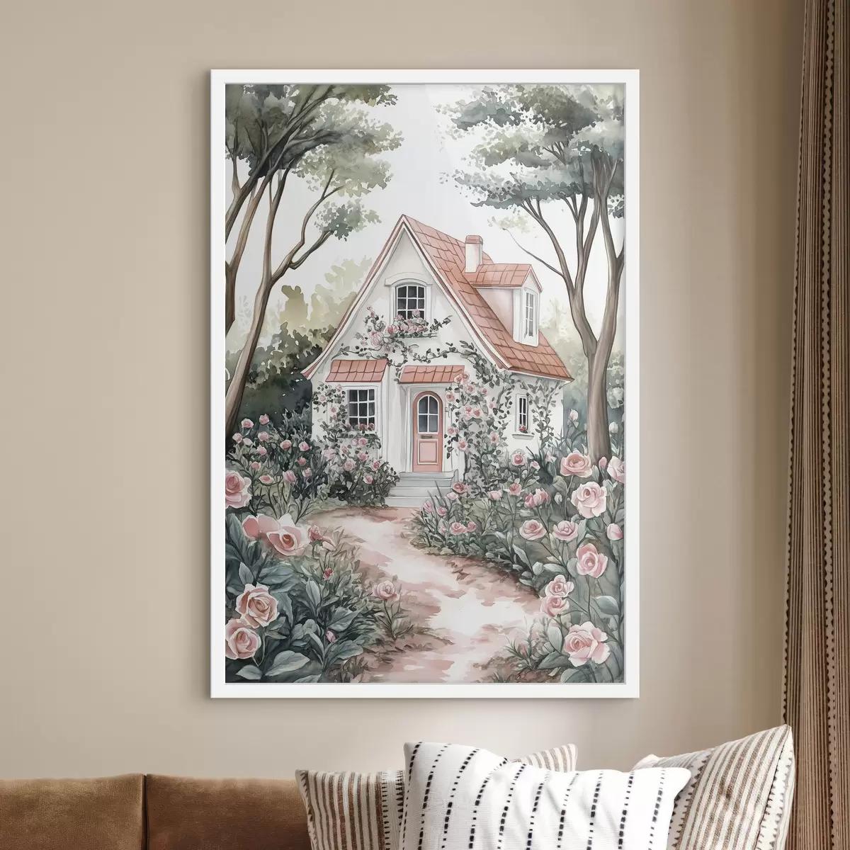 Poster Casă albă cu grădină de trandafiri în pădure Nr f44716