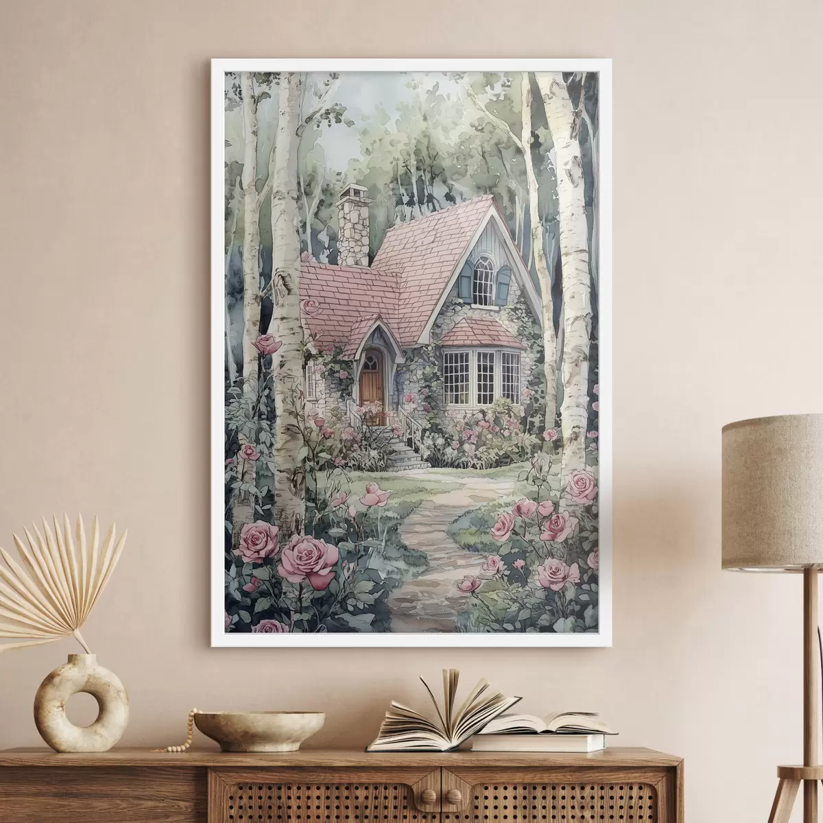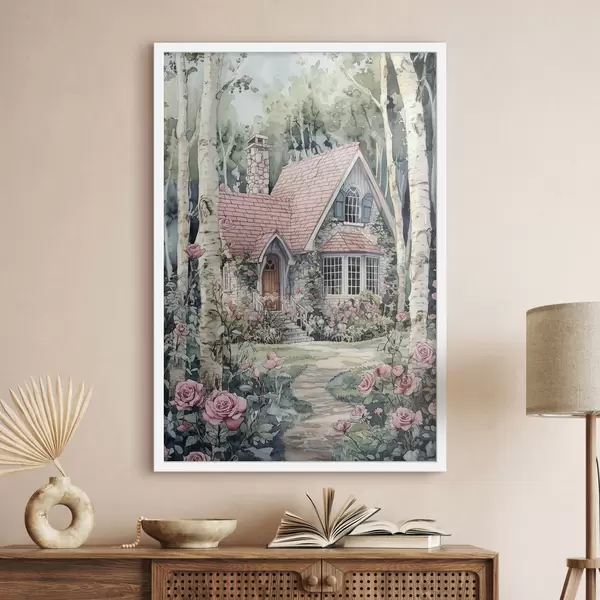 Poster Casă frumoasă în copaci de mesteacăn, grădină de trandafiri Nr f44721