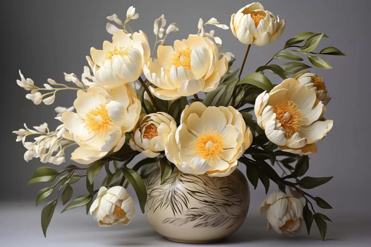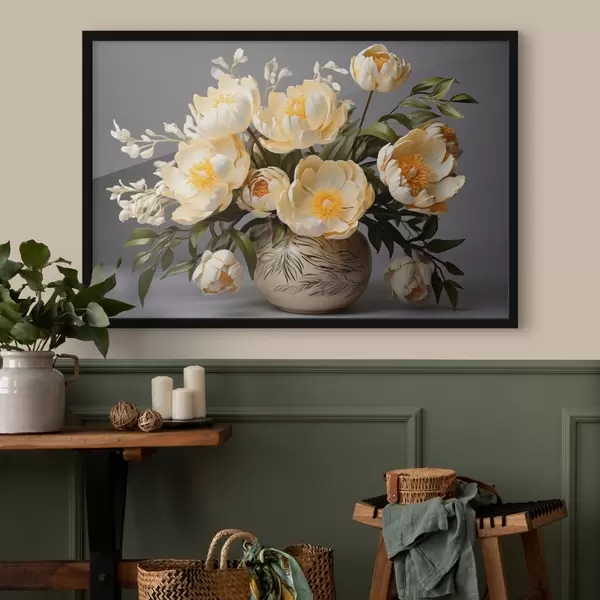 Poster Flori delicate cu centre galbene într-o vază cu model f44847
