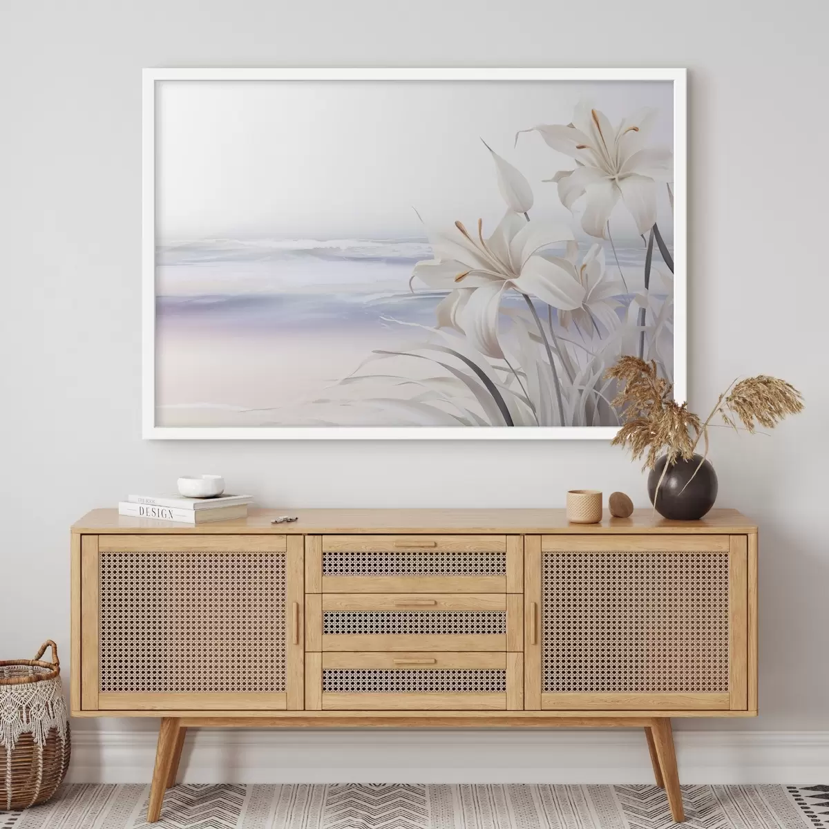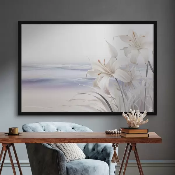 Poster Crini albi cu pistil portocaliu și frunze lungi pe o plajă cu valuri moi în fundal, culori pastelate Nr f44850