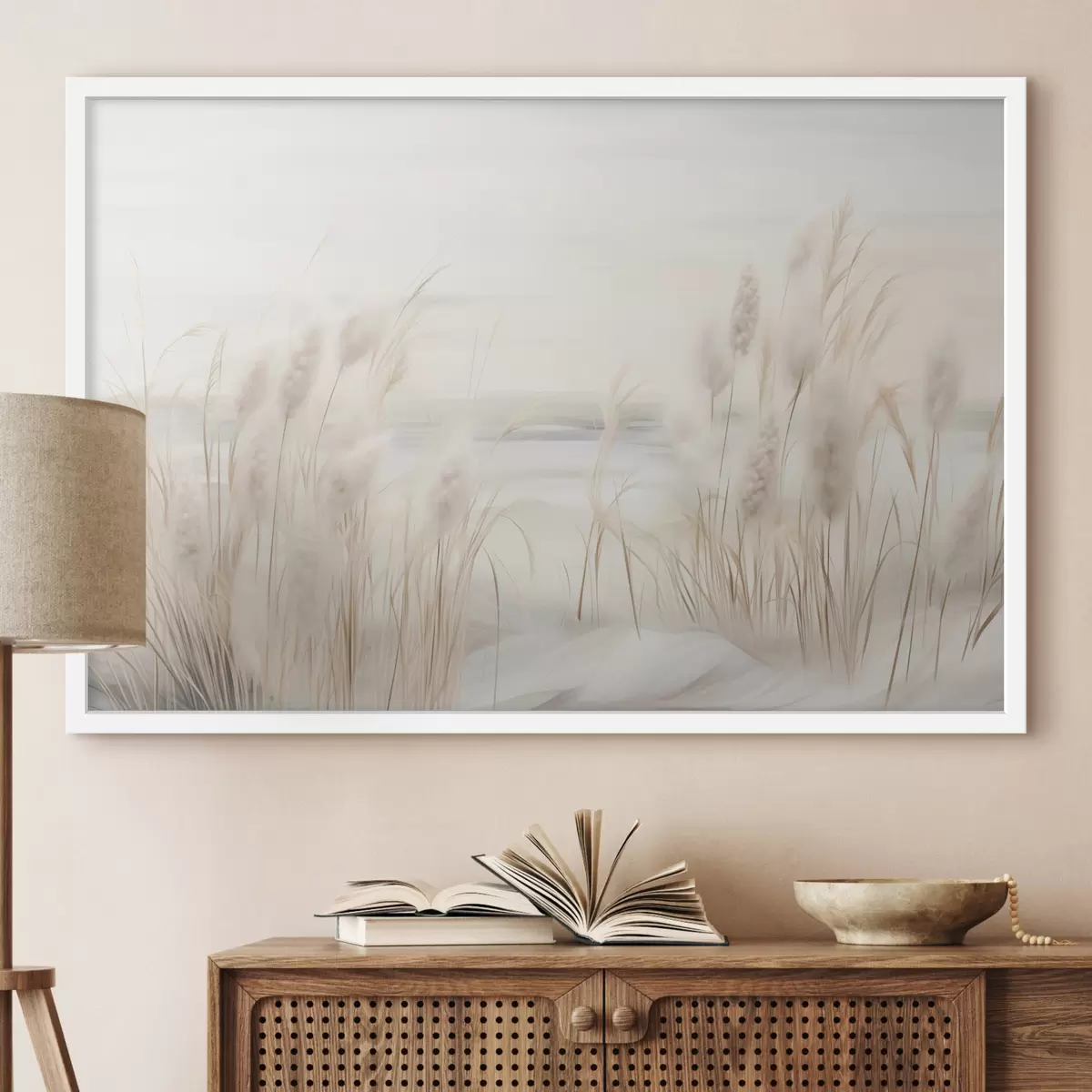 Poster Reed bej în prim-plan, cu capete de semințe, moale și delicat , un fundal neclar și un cer deschis Nr f44851