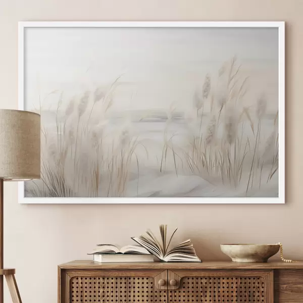 Poster Reed bej în prim-plan, cu capete de semințe, moale și delicat , un fundal neclar și un cer deschis f44851