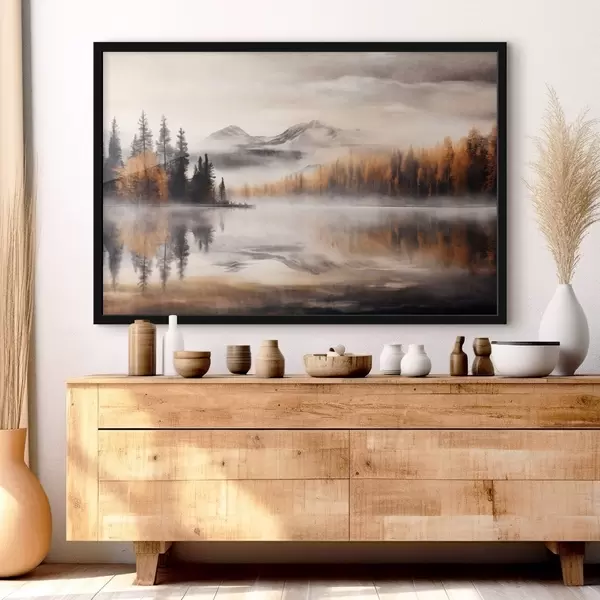 Poster Un peisaj de lac cețos texturat cu pini și munți, cer gri noros Nr f44856