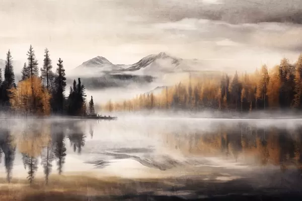 Poster Un peisaj de lac cețos texturat cu pini și munți, cer gri noros Nr f44856