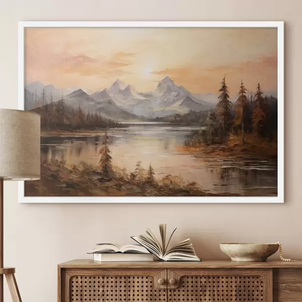 Poster Peisaj cu un lac înconjurat de copaci și munți în fundal, cer portocaliu cu soare Nr f44857