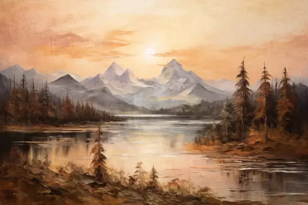 Poster Peisaj cu un lac înconjurat de copaci și munți în fundal, cer portocaliu cu soare Nr f44857