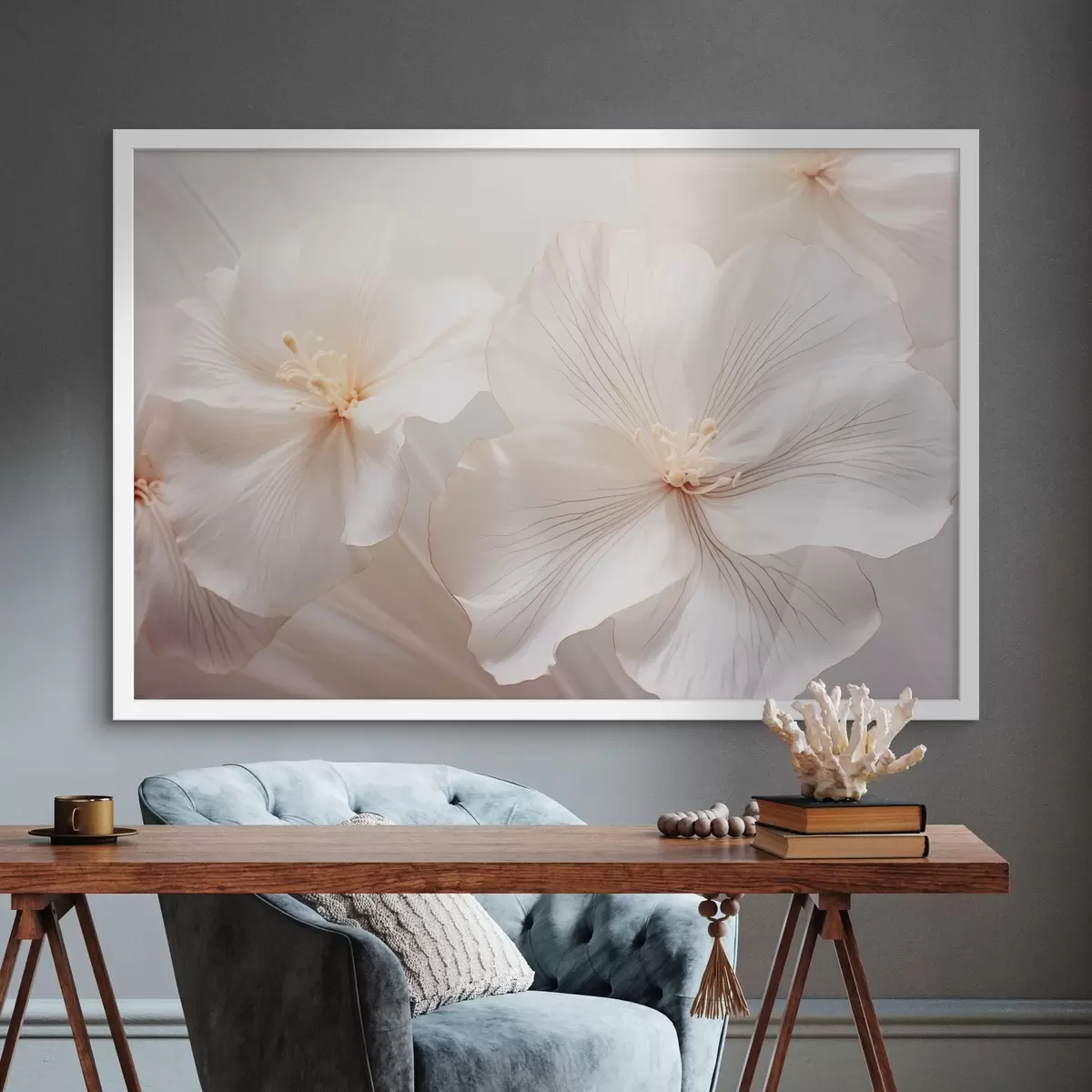 Poster Flori albe delicate cu petale și centre moi, în culori pastelate, creând o artă florală de vis și eterică f44858