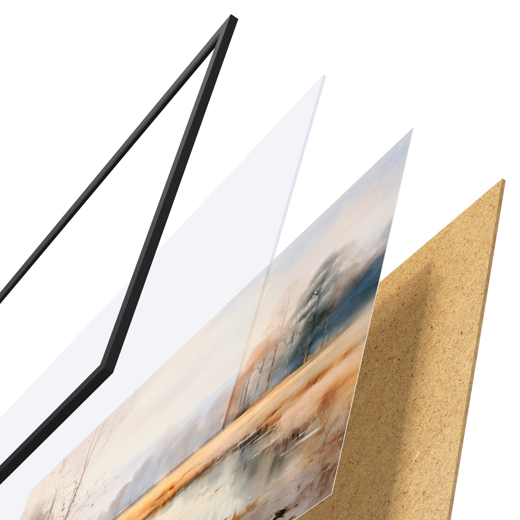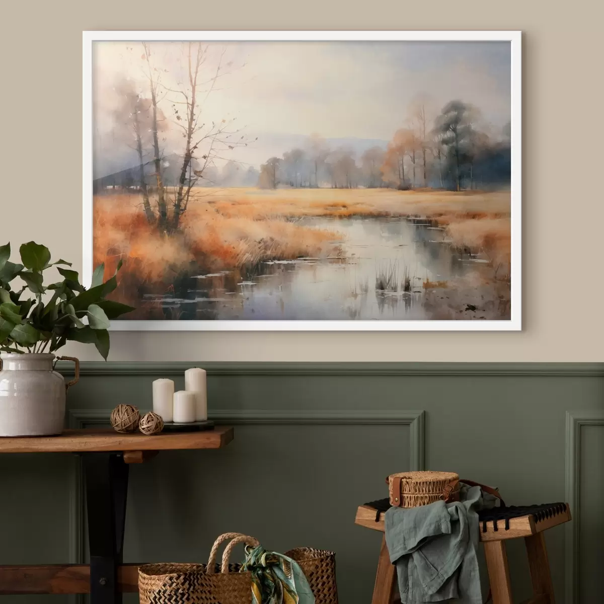 Poster Un peisaj liniștit texturat pictura imitație de stuf și copaci goi, apa calmă sub un cer Nr f44867