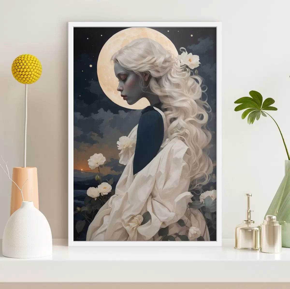 Poster Portret de fată cu păr alb și lună plină Nr f44887