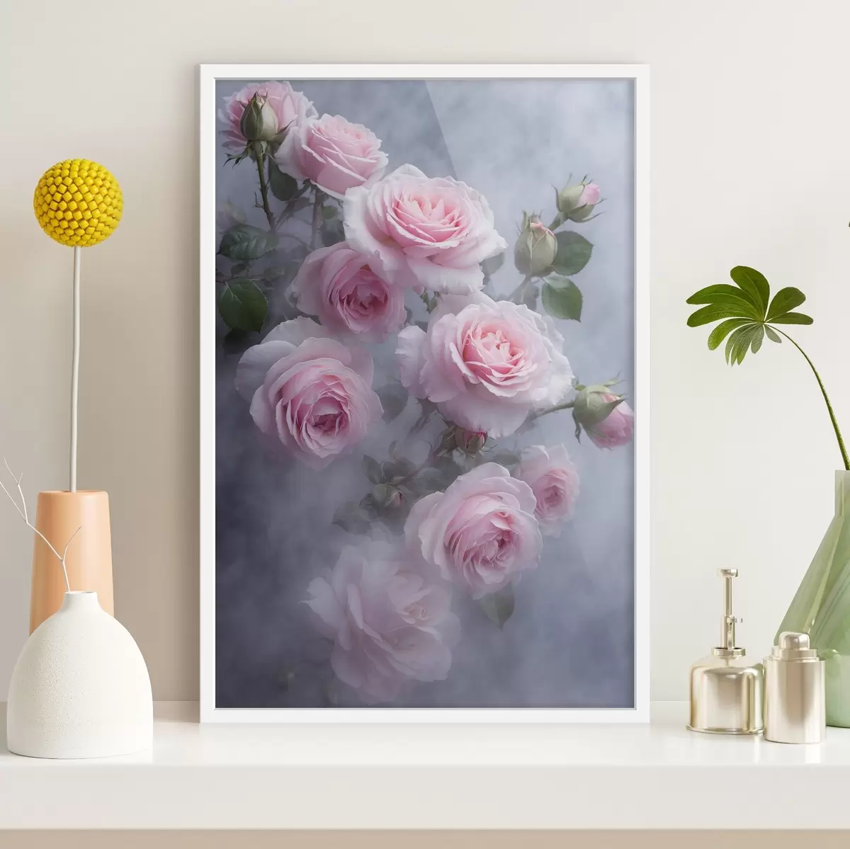 Poster Trandafiri roz moale în ceață cu frunze verzi Nr f44892
