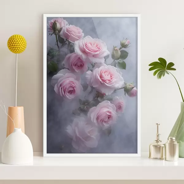 Poster Trandafiri roz moale în ceață cu frunze verzi f44892