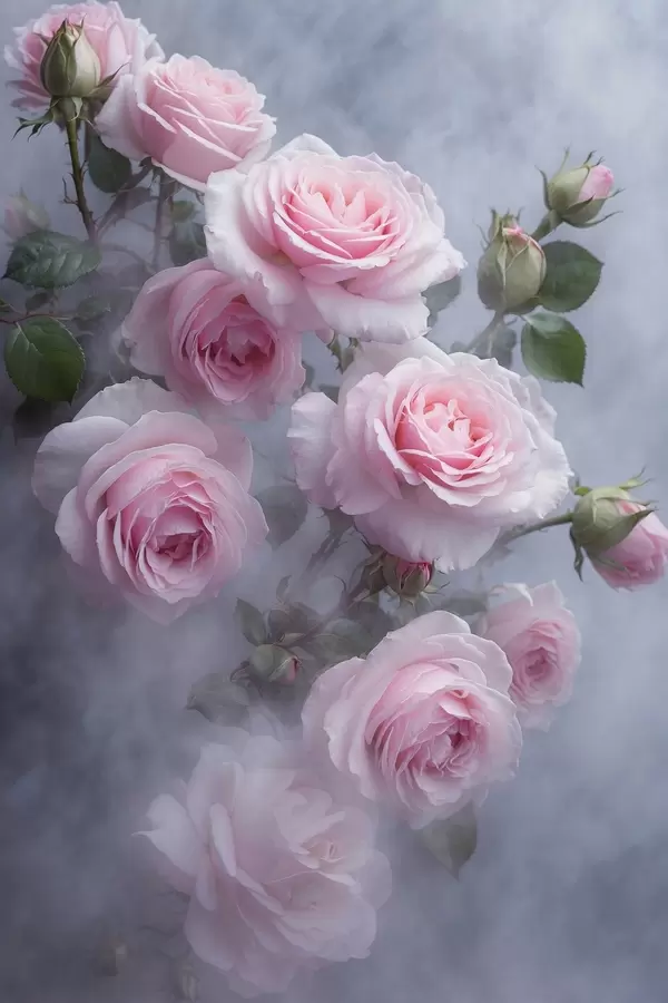 Poster Trandafiri roz moale în ceață cu frunze verzi Nr f44892
