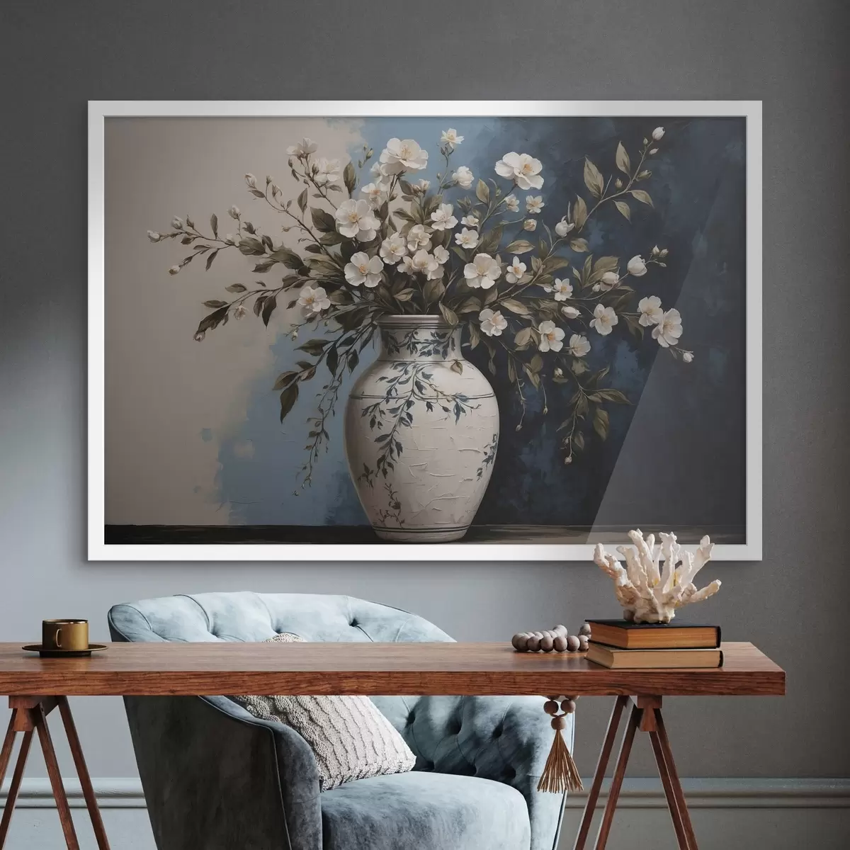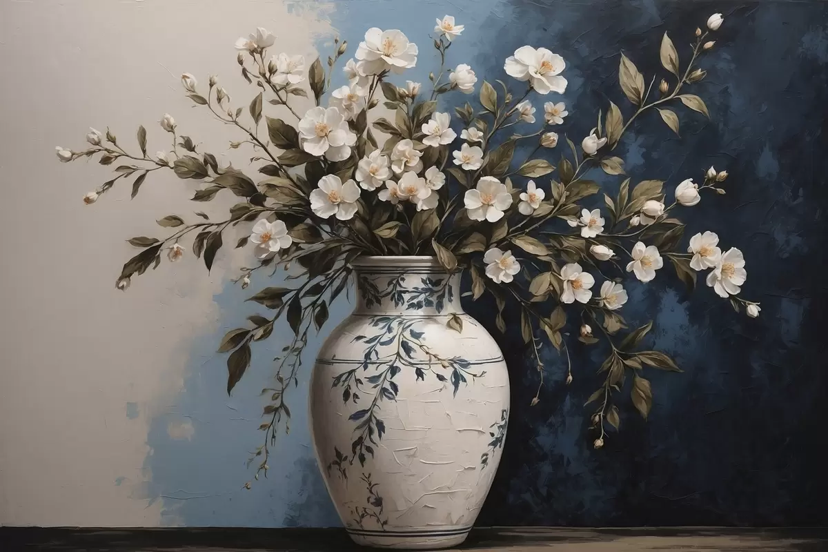 Poster Flori albe și galbene într-o vază mare pe un fundal albastru Nr f44893