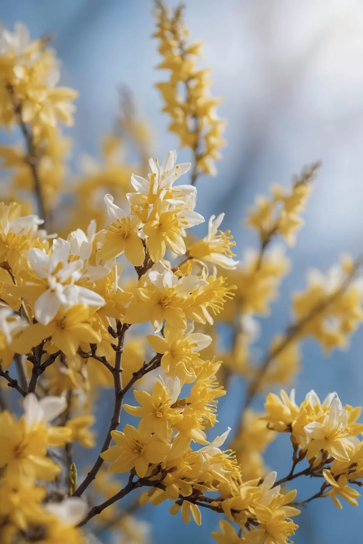 Poster Flori galbene pe un fundal albastru cu focalizare moale f44894