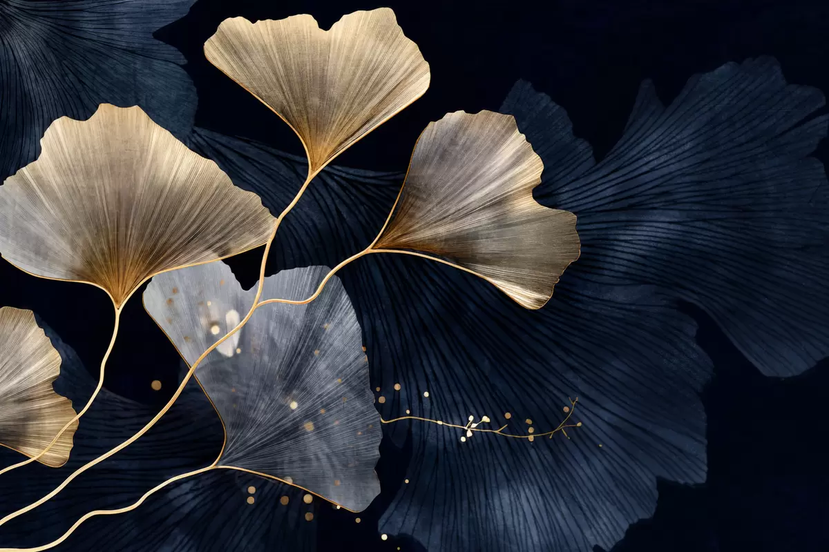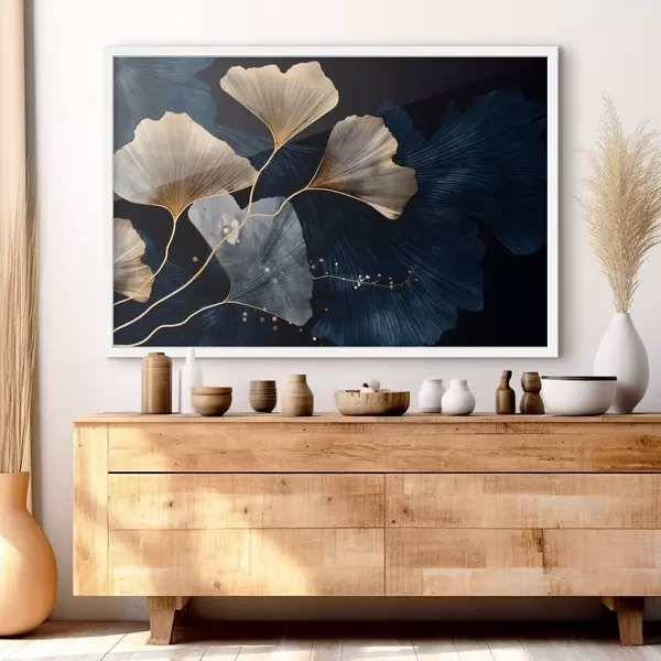 Poster Frunze Ginkgo în tonuri de galben și albastru, fundal întunecat elegant, artă modernă, stil minimalist, inspirat din natură Nr f44921
