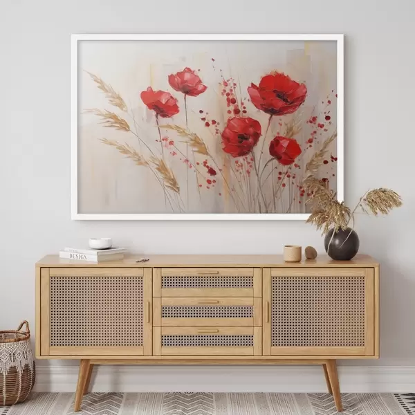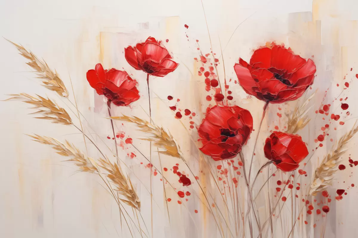 Poster Flori roșii de mac cu tulpini galbene de grâu, pe un fundal moale, neutru, cu stropi de vopsea roșie f44926