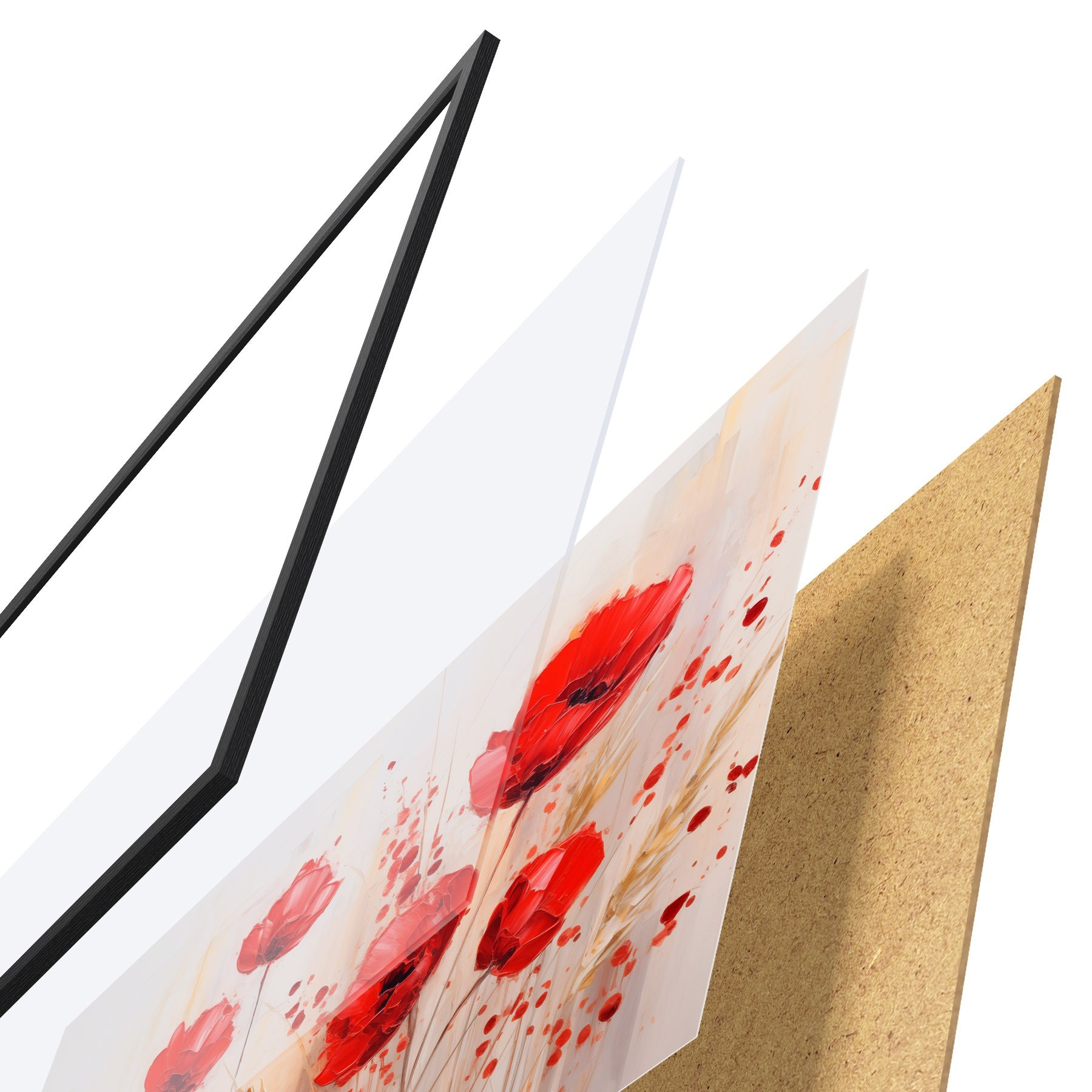 Poster Flori roșii de mac cu tulpini galbene de grâu, pe un fundal moale, neutru, cu stropi de vopsea roșie Nr f44926