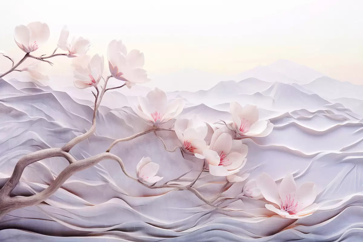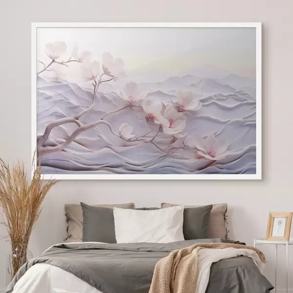 Poster Blossom ramură cu flori roz, munți în fundal, culori pastelate moi, arta japoneză texturate Nr f44930