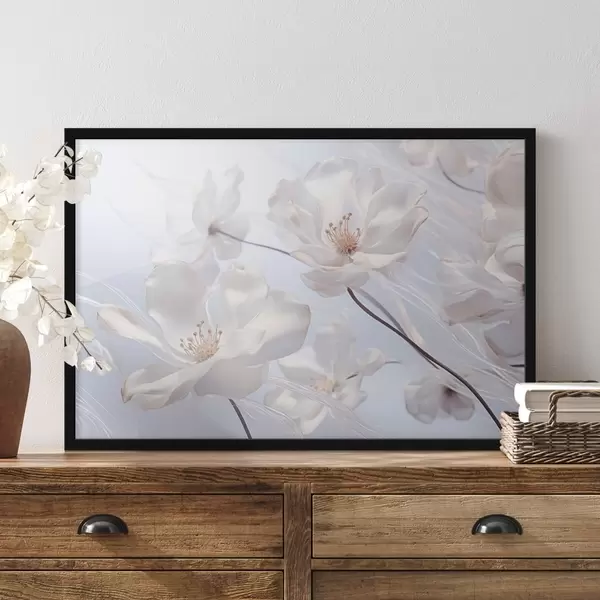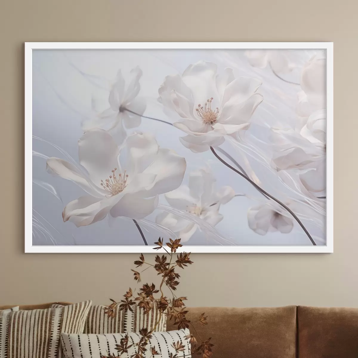 Poster Flori albe cu petale translucide, fundal albastru deschis moale, elegant, romantic, delicat, visător Nr f44931