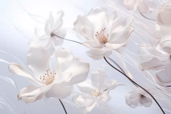 Poster Flori albe cu petale translucide, fundal albastru deschis moale, elegant, romantic, delicat, visător Nr f44931