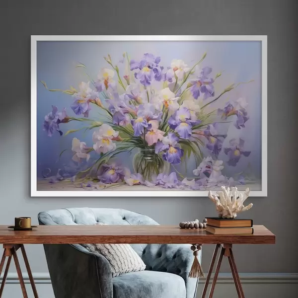 Poster O vază cu multe iriși pastelate, câteva petale împrăștiate pe masă, fundal moale pastel cu tonuri de albastru și roz Nr f44933
