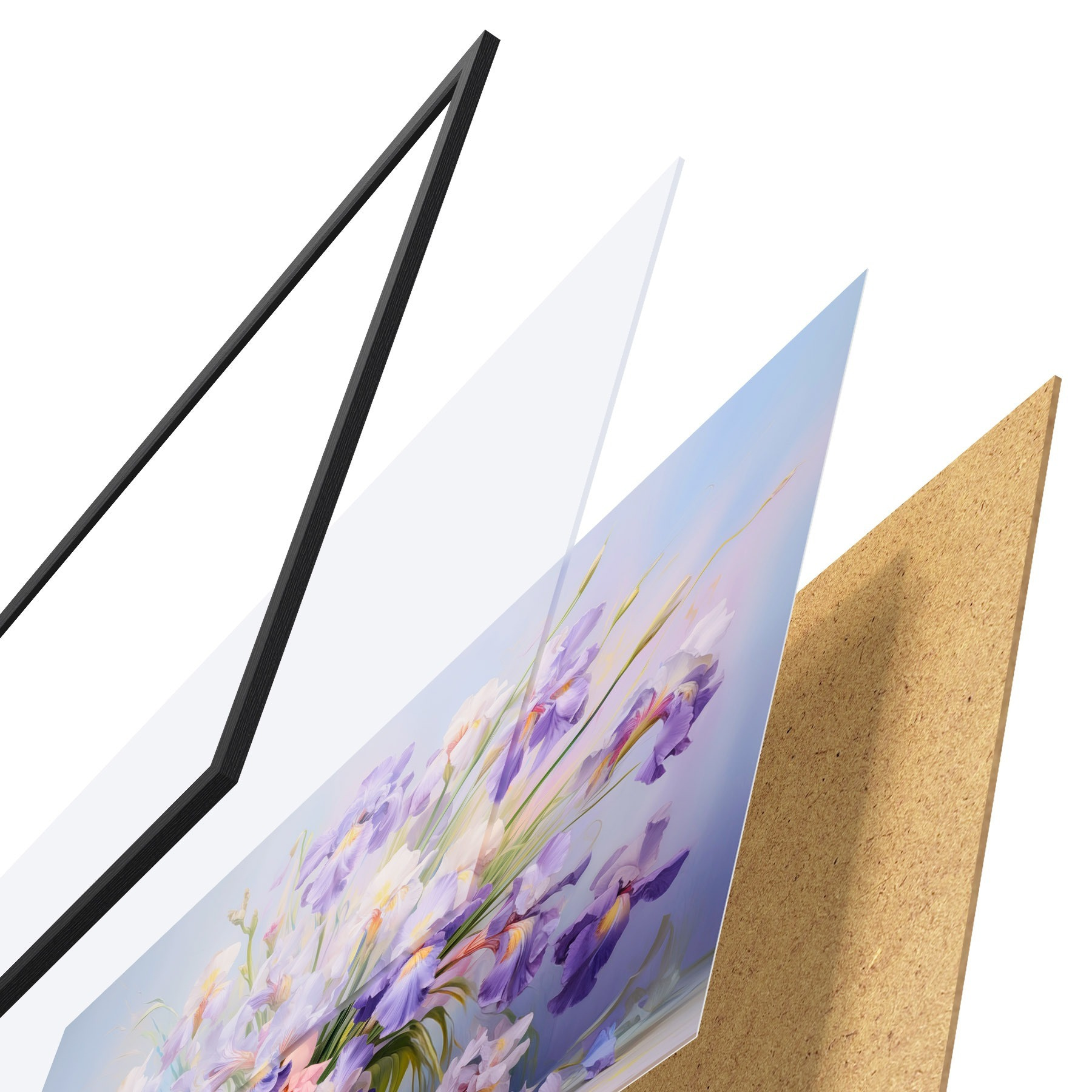 Poster O vază cu multe iriși pastelate, câteva petale împrăștiate pe masă, fundal moale pastel cu tonuri de albastru și roz f44933