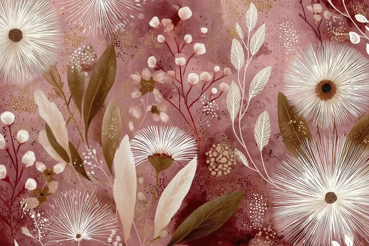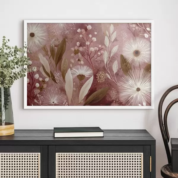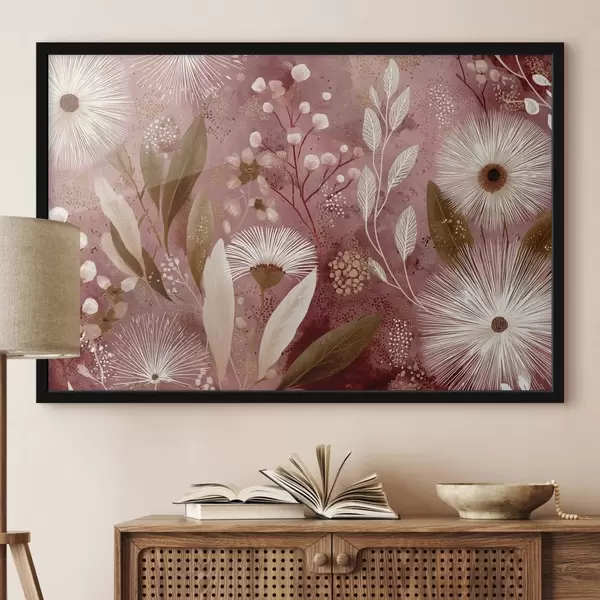 Poster Boho stil flori albe pe fundal roșu, desen detaliat f44979