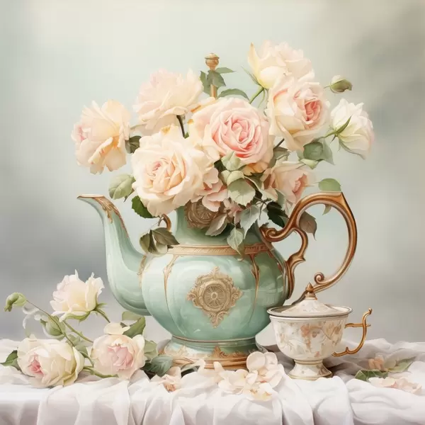 Poster Natură statică cu trandafiri delicați într-un set de ceai Nr f45045