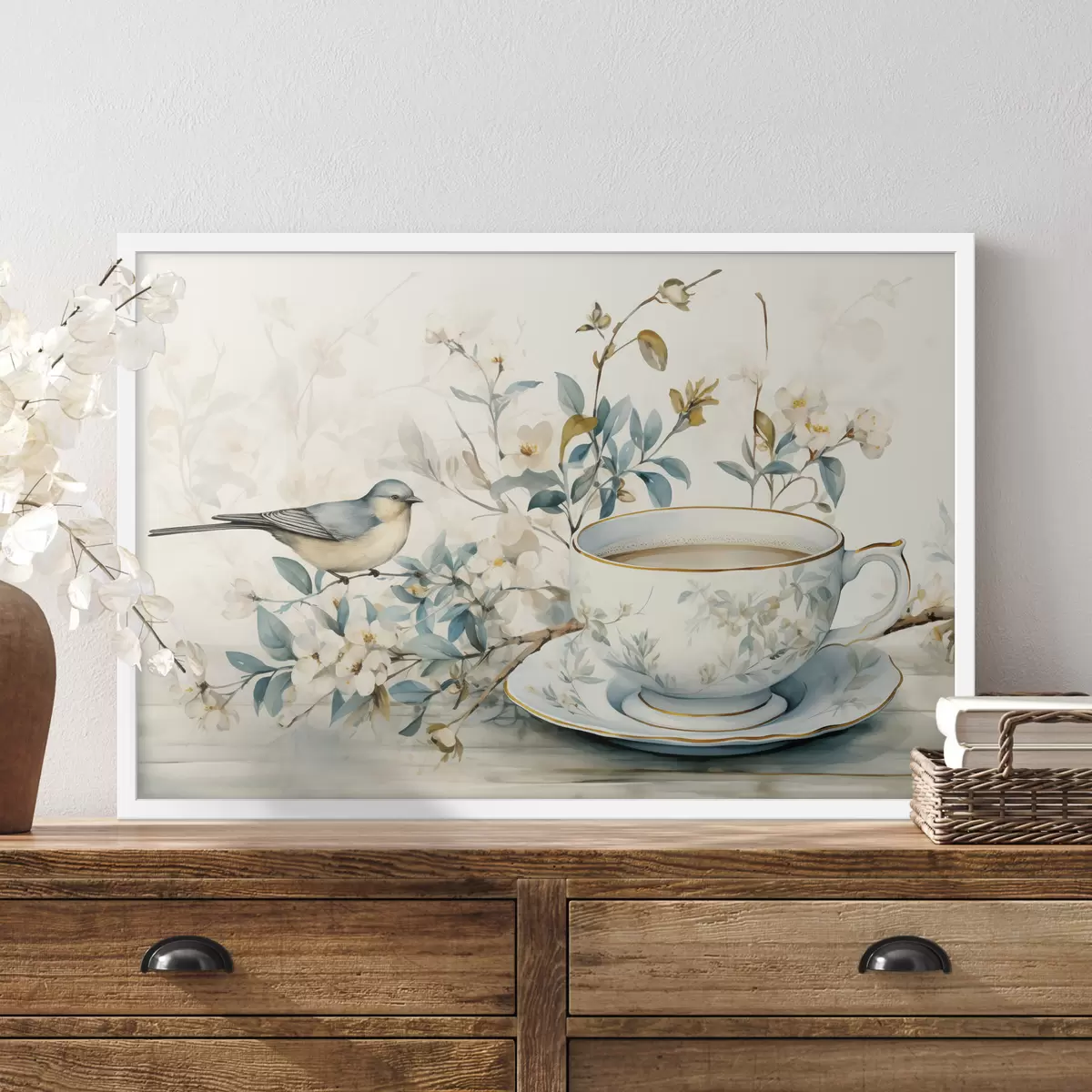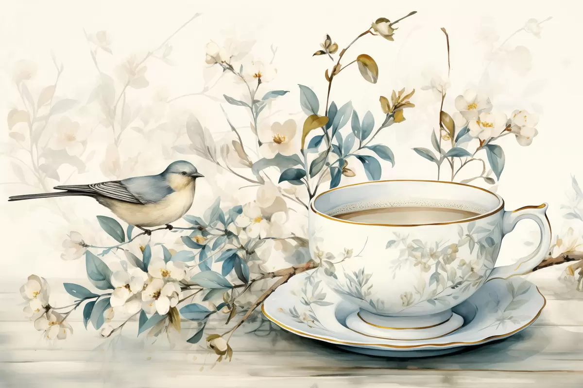 Poster Pasăre pe o ramură cu flori lângă o ceașcă în tonuri pastelate Nr f45047