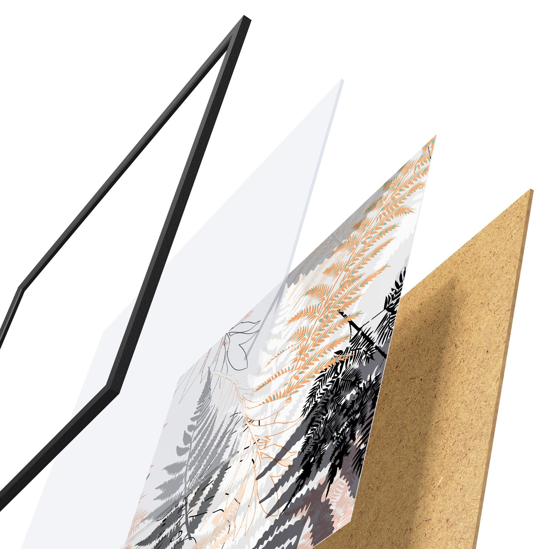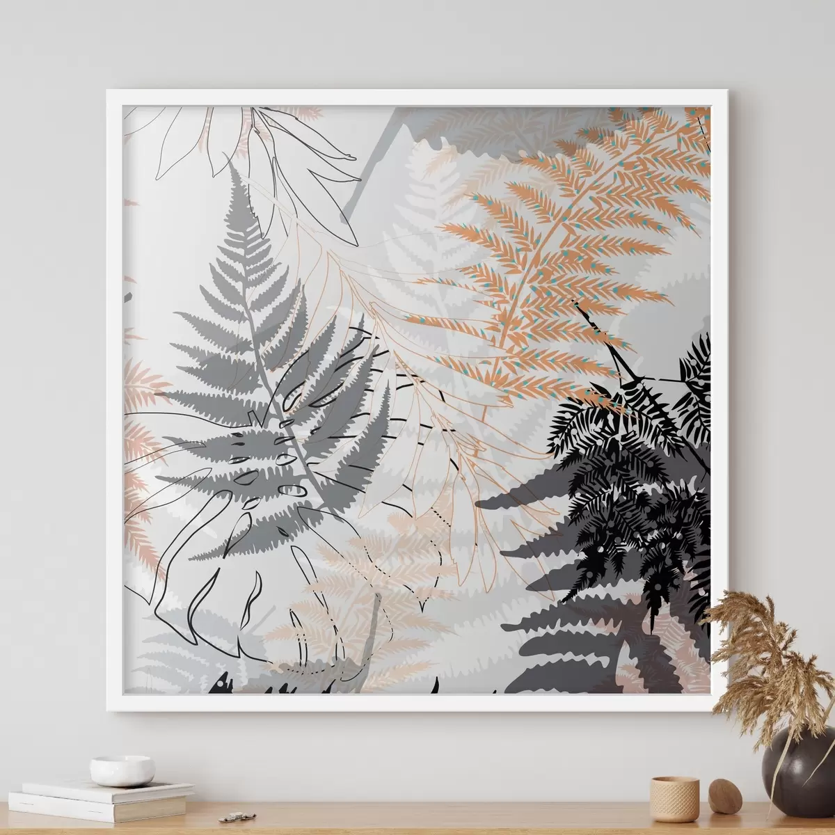 Poster ferigă, frunze abstracte, model, design plat, contrast, tonuri de gri, botanic, suprapunere f45101